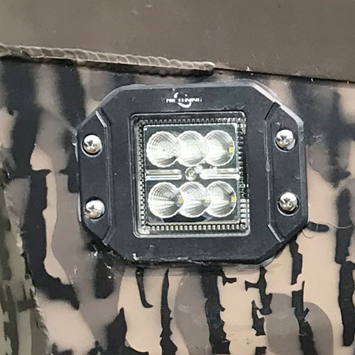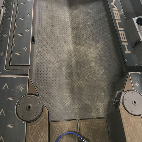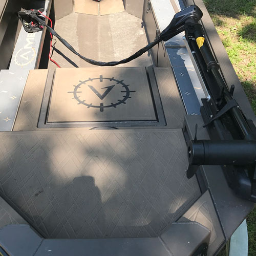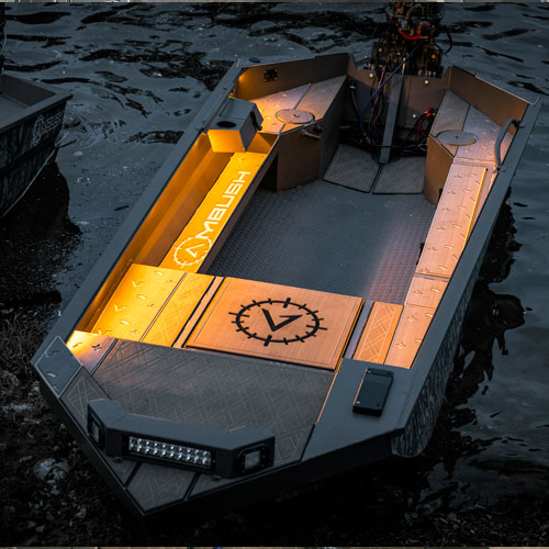 The AMBUSH is engineered for maximum durability and exceptional performance. Crafted from high-quality .100-gauge aluminum, its robust hull is built to withstand the harshest conditions. The hull’s strength is enhanced by five longitudinal ribs, critical structural components that run lengthwise to provide superior rigidity, distribute loads evenly, and ensure safety and durability in demanding environments. This innovative hull design optimizes stability and hydrodynamic efficiency, allowing the AMBUSH to slice through water with precision while maintaining balance under heavy loads. The AMBUSH excels in shallow water, effortlessly navigating marshes, flats, and timber-laden areas with a shallow draft that ensures smooth handling in skinny waters.